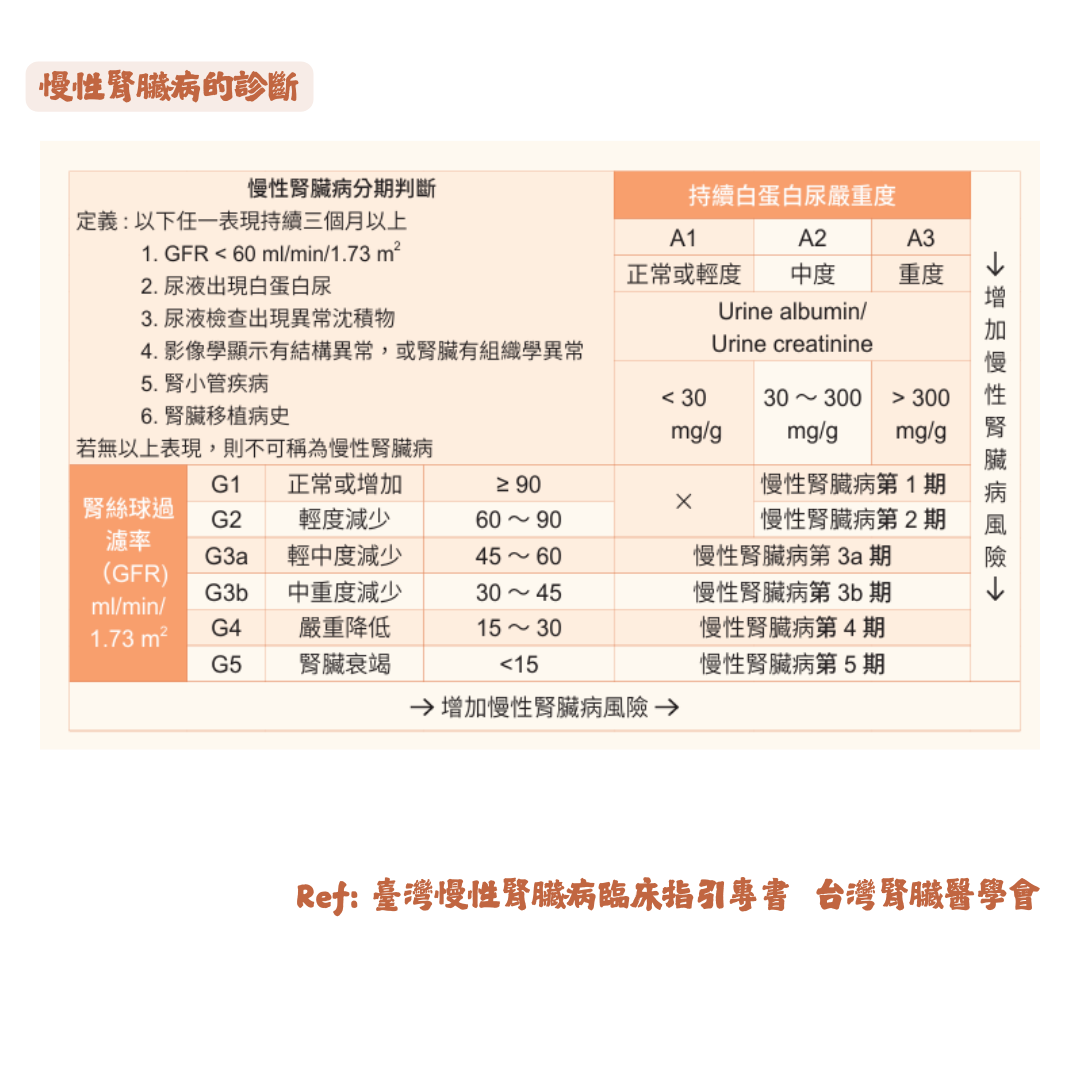 (CKD)進入末期腎病(ESRD)之風險60%」、「中西醫合併療法可降低慢性腎病者的洗腎風險、有助糖尿病人控制病情,延緩進入洗腎的時間」,也用自身的經驗認為Stage 2到Stage 3A有機會逆轉,其他期則以穩定狀況為主。