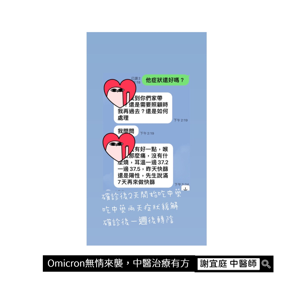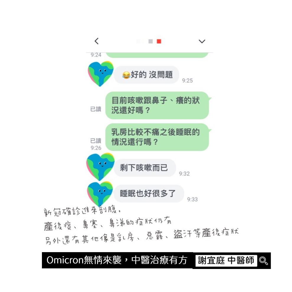 H媽媽,產前因為大寶感染,36周確診新冠肺炎後入院剖腹,產後隔天,咳嗽的狀況頻繁、很癢、痰白不黏、鼻塞、因為咳嗽所以傷口很痛,無發燒畏寒但睡得不太好,醒後常會有冒汗的情況,產後有打退奶針,因為在隔離病房當中媽媽覺得服用煎劑不太方便,所以全程使用科學中藥治療,先使用杏蘇散幼科加上辛夷清肺湯去處理宣肺祛痰、宣通鼻翹,在微加一些滋陰清熱的藥物去處理產後/感染後引起的汗症,症狀很快就緩解了,隨後病房隔離期間乳脹痛出現,也是立刻使用瓜蔞牛蒡子湯加減通乳散結的藥物處理腫脹痛的情況,也是快速有效。