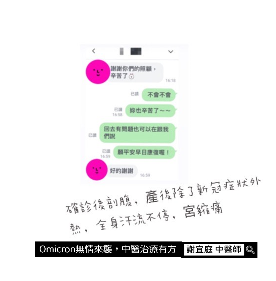 I媽媽,36+3周確診後,剖腹後身體很疲倦,還有發燒,不論日夜全身大冒汗,覺得身體很烘熱,媽媽表示雖然孕後期也是會感到熱,但產後這種身體熱、一直不停冒汗的感覺非常不舒服,痰很黏非常難咳,產後宮縮痛的狀況也時常發作,因為在隔離病房當中媽媽覺得服用煎劑不太方便,也是全程使用科學中藥治療,使用柴陷湯跟定喘湯的加減,清熱化痰、寬胸散結,再加入一些幫助惡露、止痛化瘀的藥物處理頻繁發作的宮縮痛,1-2天後汗跟熱的情況解緩解許多。