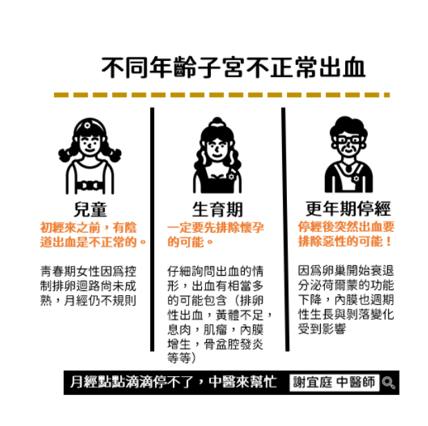 其實不同的年齡層有著不同的意義,兒童在初經來之前,有陰道出血都是不正常的。常見原因有外傷、異物置入、局部的刺激過敏反應(如:清潔劑、乳液的刺激)和泌尿道感染。都要特別留意。