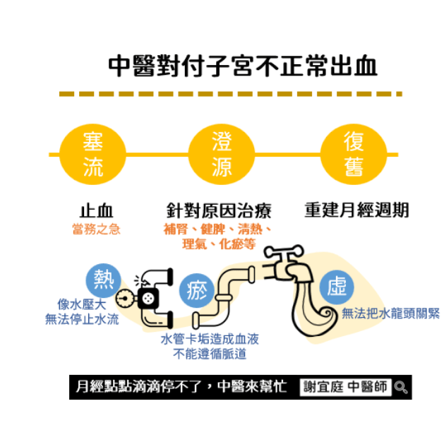 崩漏常見的原因不外乎「虛、瘀、熱」,用水管比喻:「虛」像無法把水龍頭關緊,常見像氣虛,氣不能收攝血液;「瘀」就像水管卡垢,造成血液不能遵循脈道,例如一些器質性的病變子宮肌瘤、子宮內膜異位,瘜肉等;「熱」就像水壓大無法停止水流,虛熱、實熱都有,更年期導致的熱,熬夜所引起的熱都有可能。