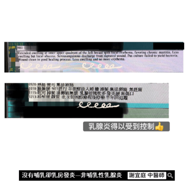 37歲的X小姐,從去年9月開始發生左側乳房發炎當時服用抗生素後有緩解,生過一胎,小孩目前大班,今年三月又開始發作,吃類固醇後,左側乳房發炎的狀況還是起起落落,經常嚴重的時候左側乳房到鎖骨的範圍整個都是硬的,皮膚表皮會紅腫熱痛,膿包會經皮潰破,流出膿液,破潰的傷口常常癒合得很慢,膿液細菌培養不出細菌,常常需要做引流或是切開傷口,引流後會緩解但過幾天又會開始變硬,加上吃類固醇後整個面部跟身體都很腫脹,體重飆升,所以今年9月的時候,就來門診看看有沒有其他的方法。