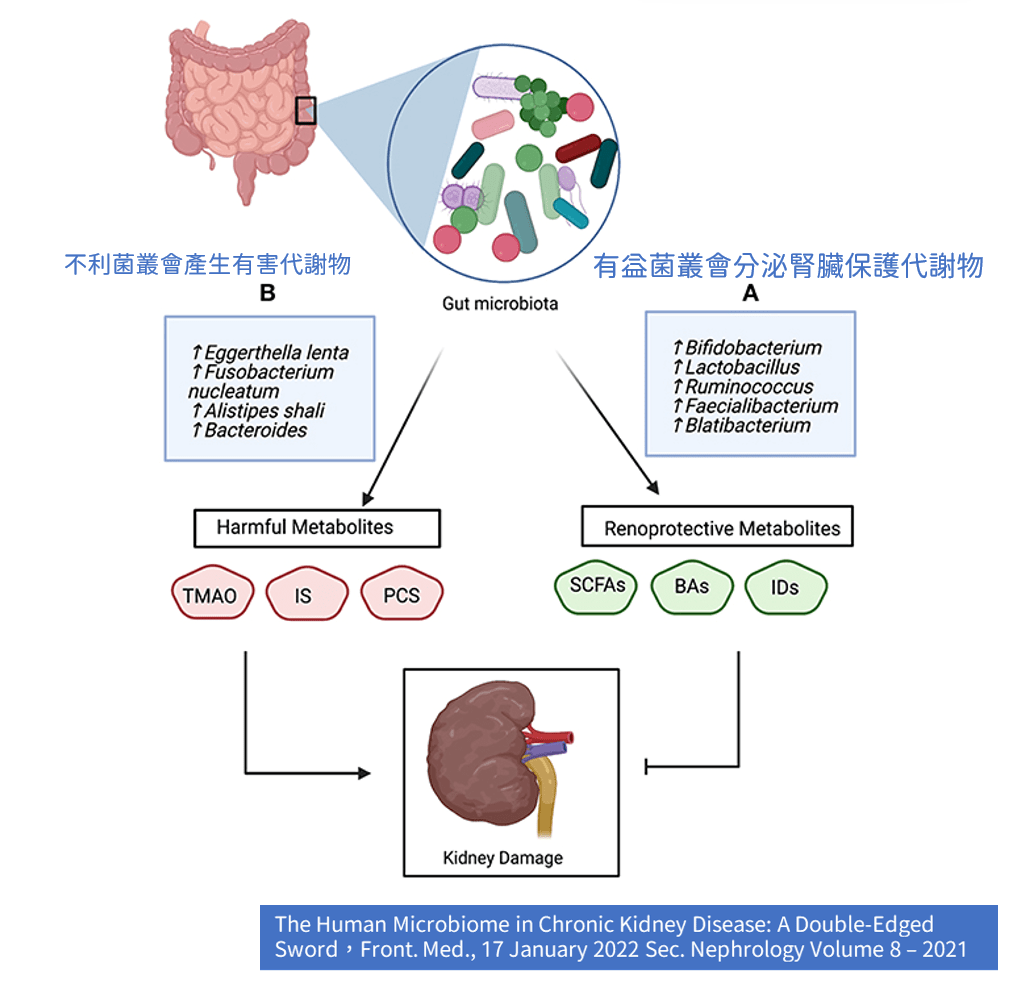 有益的腸道菌叢會產生抑制腎臟損傷的腎臟保護性代謝物;而不利菌叢會產生有害代謝物,促進腎臟損傷和慢性腎臟病的進展,像是:Trimethylamine N-oxide (TMAO), indoxyl sulfate (IS), p-cresyl sulfate (PSC), short-chain fatty acids (SCFAs), bile acids (Bas), and Indole derivatives (IDs) 屬於小分子親蛋白質化合物類的尿毒素。