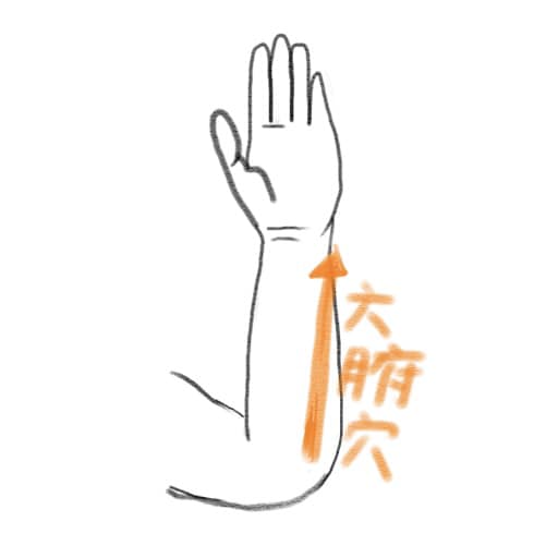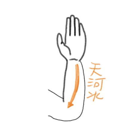 位於尺側緣,以併攏的中指食指在前臂尺側,由手肘方向起推至手腕方向,推100-300次(一至三分鐘)。清熱,適合清天河水施作後沒有退熱的情況。