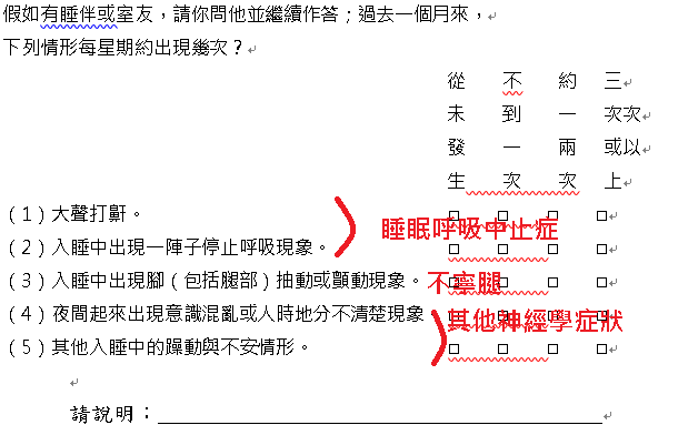 此量表是跟據過去一個月,從睡眠習慣,睡眠狀況,是否需要使用藥物,日間症狀,跟室友伴侶的觀察來做評估。就可以透露許多有趣的資訊!整體分數 >5分睡眠差者; 整體分數 ≦5分睡眠好者