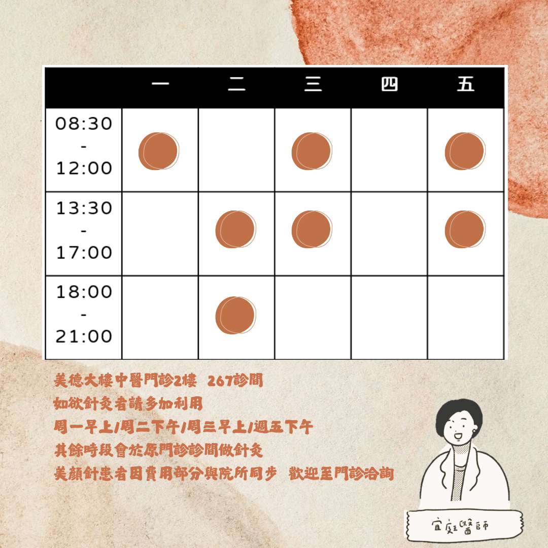 在美德大樓中醫門診2樓 267診間,相關開診細節有置頂讓大家方便搜尋,如欲針灸者請多加利用周一早上/周二下午/周三早上/週五下午,其餘時段會於原門診診間做針灸,美顏針患者因費用部分與院所同步歡迎至門診洽詢。(之後還會設立美顏針的預約方式,再請大家留意唷!)